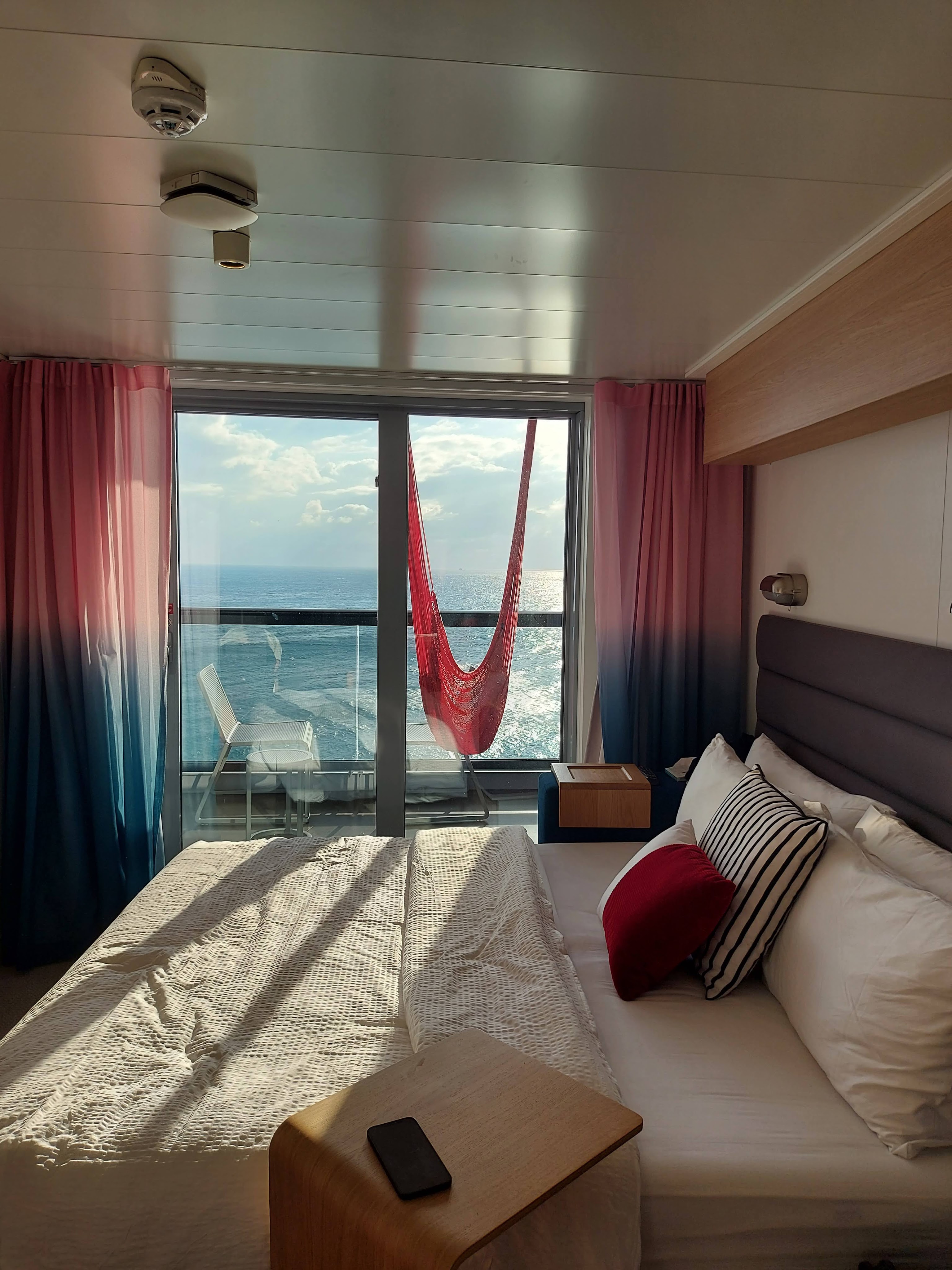 We booked a Sea Terrace cabin with a balcony and their iconic red hammock that I used more often than I thought I would. The room was spacious, beds and pillows were very comfortable. The entire room was controlled via an iPad (e.g. curtains, mood lights, ordering room service).